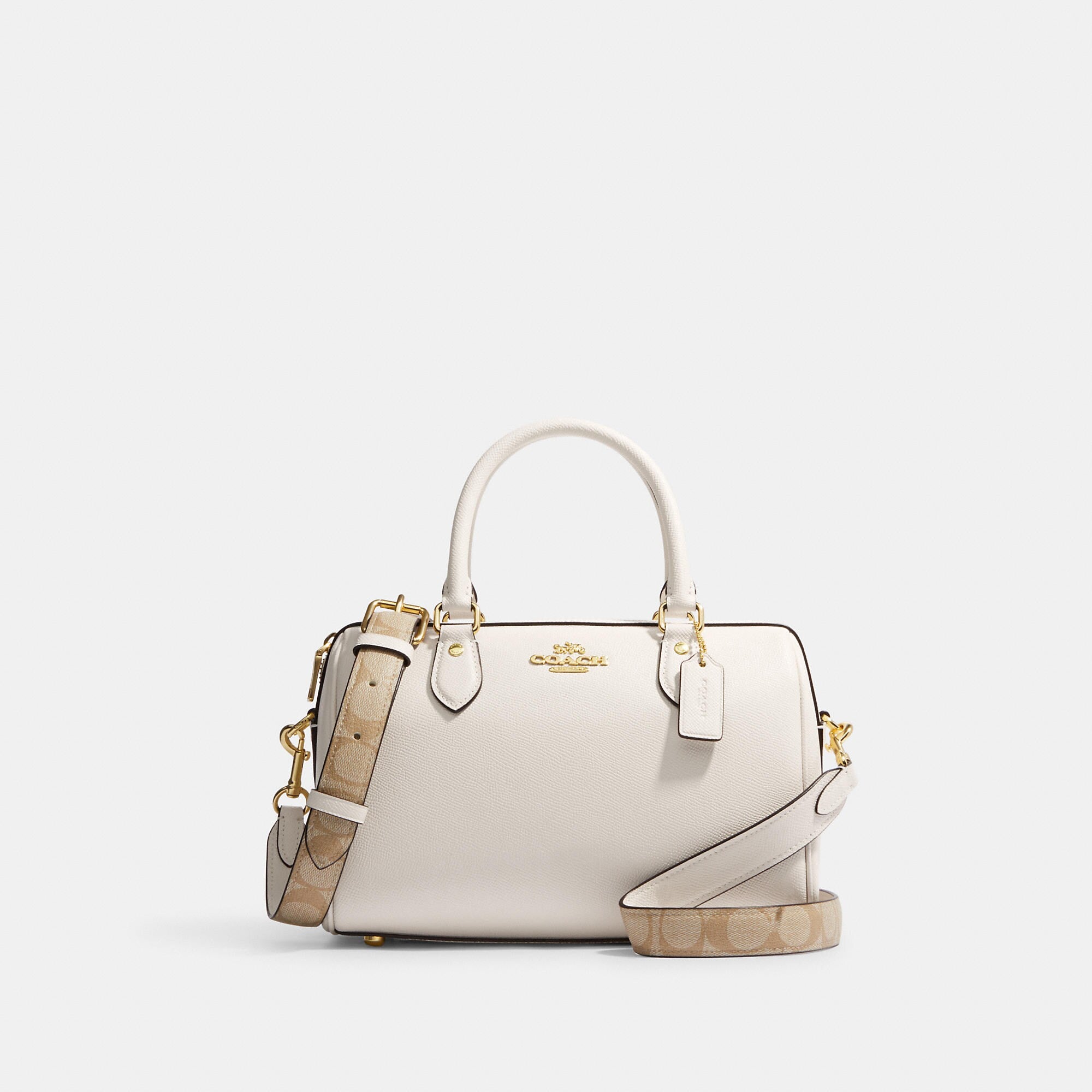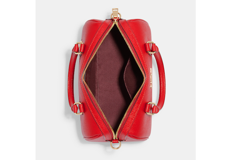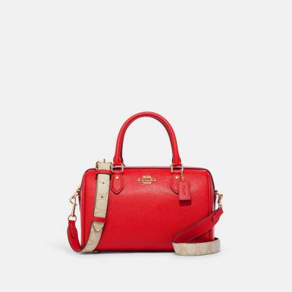 Crossgrain leather and Signature coated canvas Inside zip and multifunction pockets Zip closure fabric lining Handles with 4 1/4 drop Outside zip pocket Detachable strap with 23 drop for shoulder or crossbody wear Four protective feet at base 10 (L) x 6 1/2 (H) x 5 1/2 (W) Style No. CH322 | Outlet Rowan Satchel With Signature Canvas Detail - Red