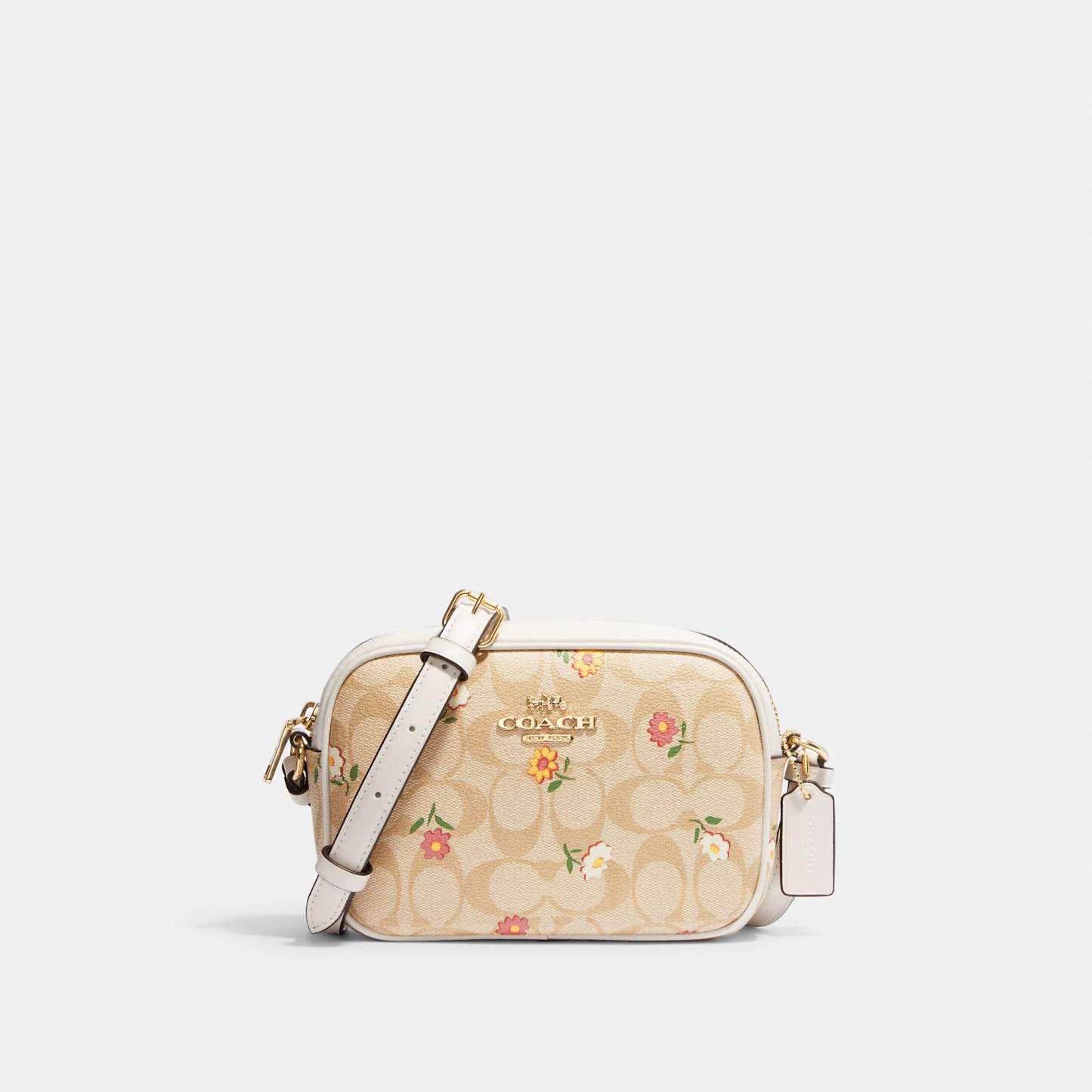 Signature coated canvas and smooth leather Two credit card slots Inside multifunction pocket Zip closure fabric lining Outside open pocket Detachable strap with 22 3/4 drop for shoulder or crossbody wear 7 1/2 (L) x 5 1/4 (H) x 2 1/4 (W) Style No. CH475 | Outlet Mini Jamie Camera Bag In Signature Canvas With Nostalgic Ditsy Print - Multi