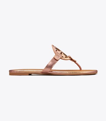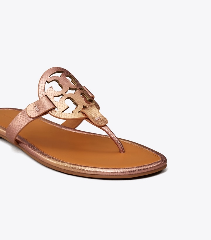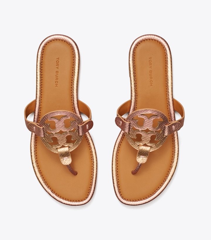 Our iconic Miller Sandal, in metallic snake-embossed leather, features an ultra-comfortable cushioned insole, a seamlessly wrapped toe post and a laser-cut double 'T' with hand-painted edges, positioned to hug the foot for a perfect fit. Always chic, it's a beloved classic for sunny days and getaways.