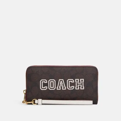 Signature coated canvas and smooth leather Twelve credit card slots Full-length bill compartments Inside zip coin pocket Zip-around closure Detachable wrist strap 7 1/2 (L) x 4 (H) x 1 (W) Fits all iPhone and Samsung Galaxy phones Style No. CB856