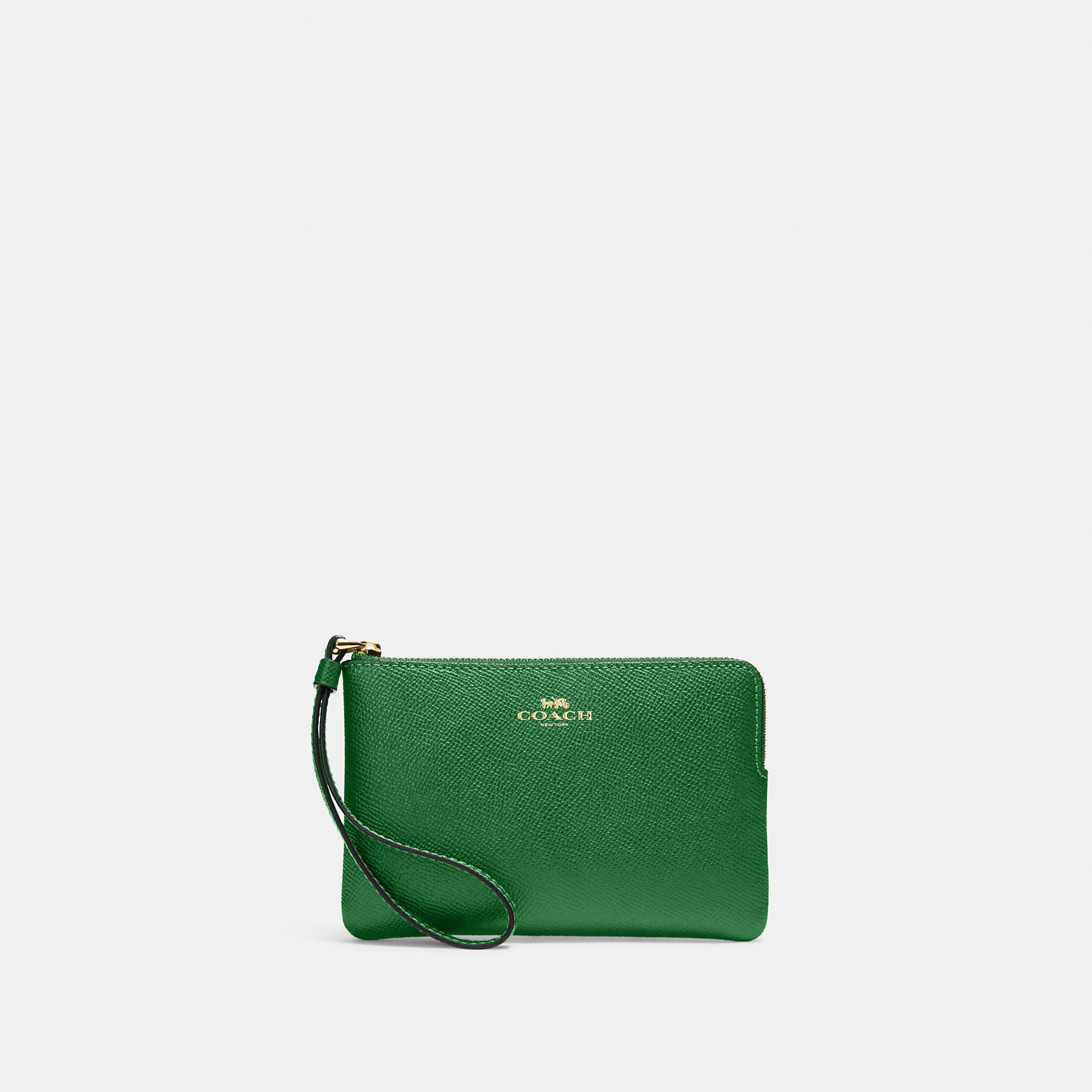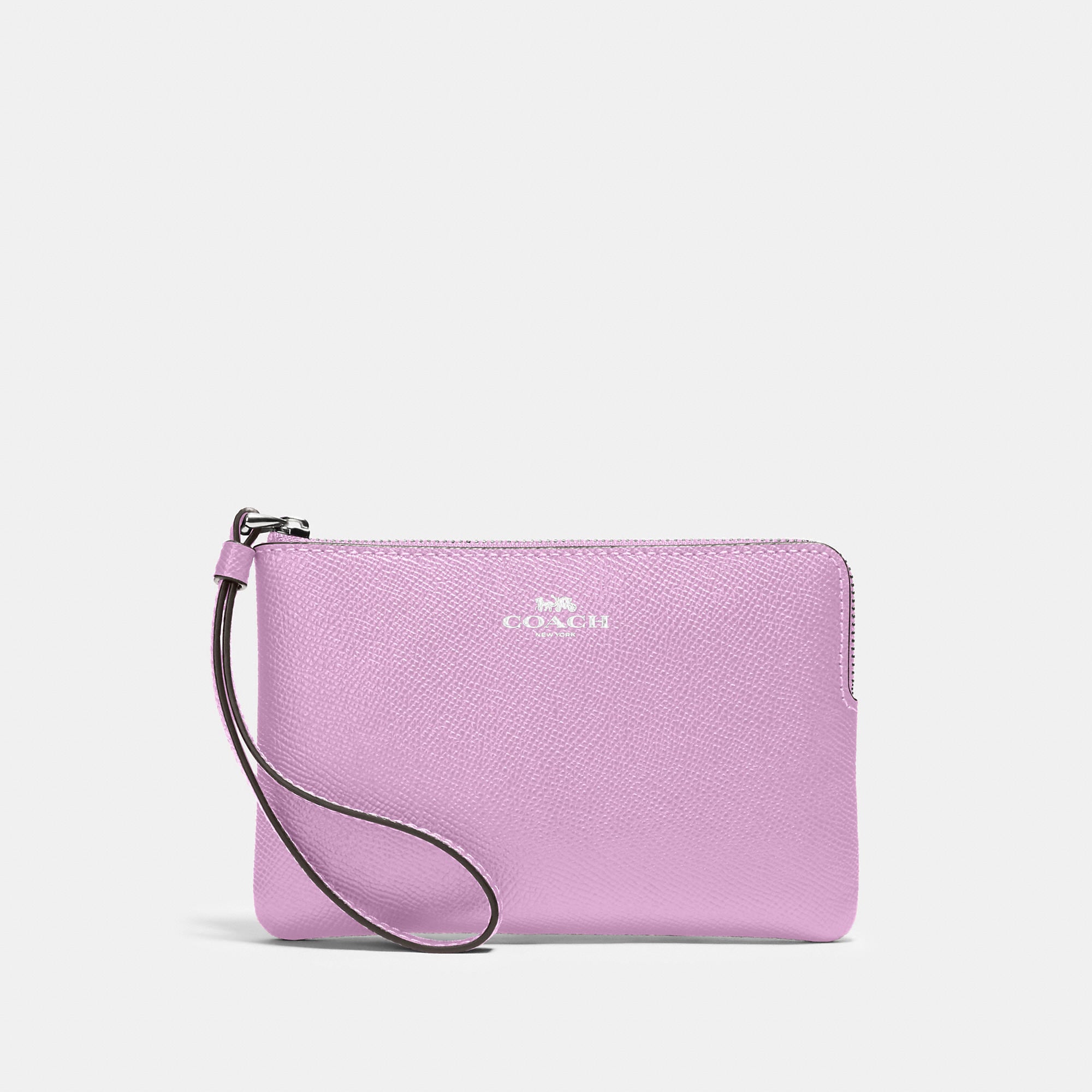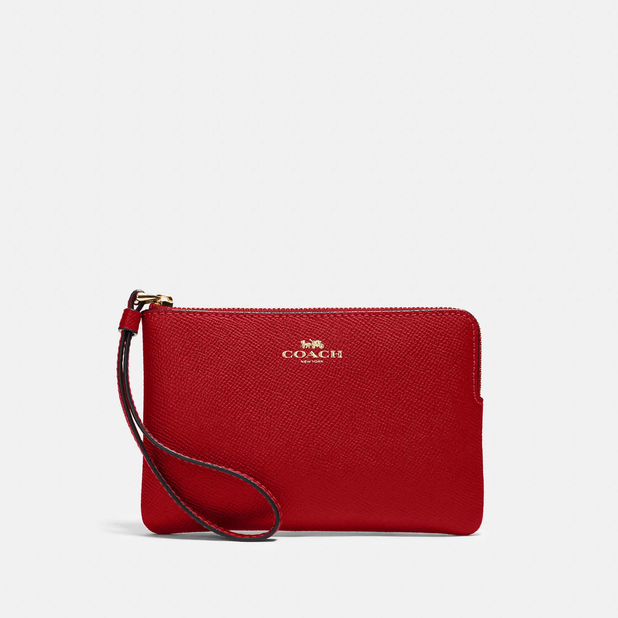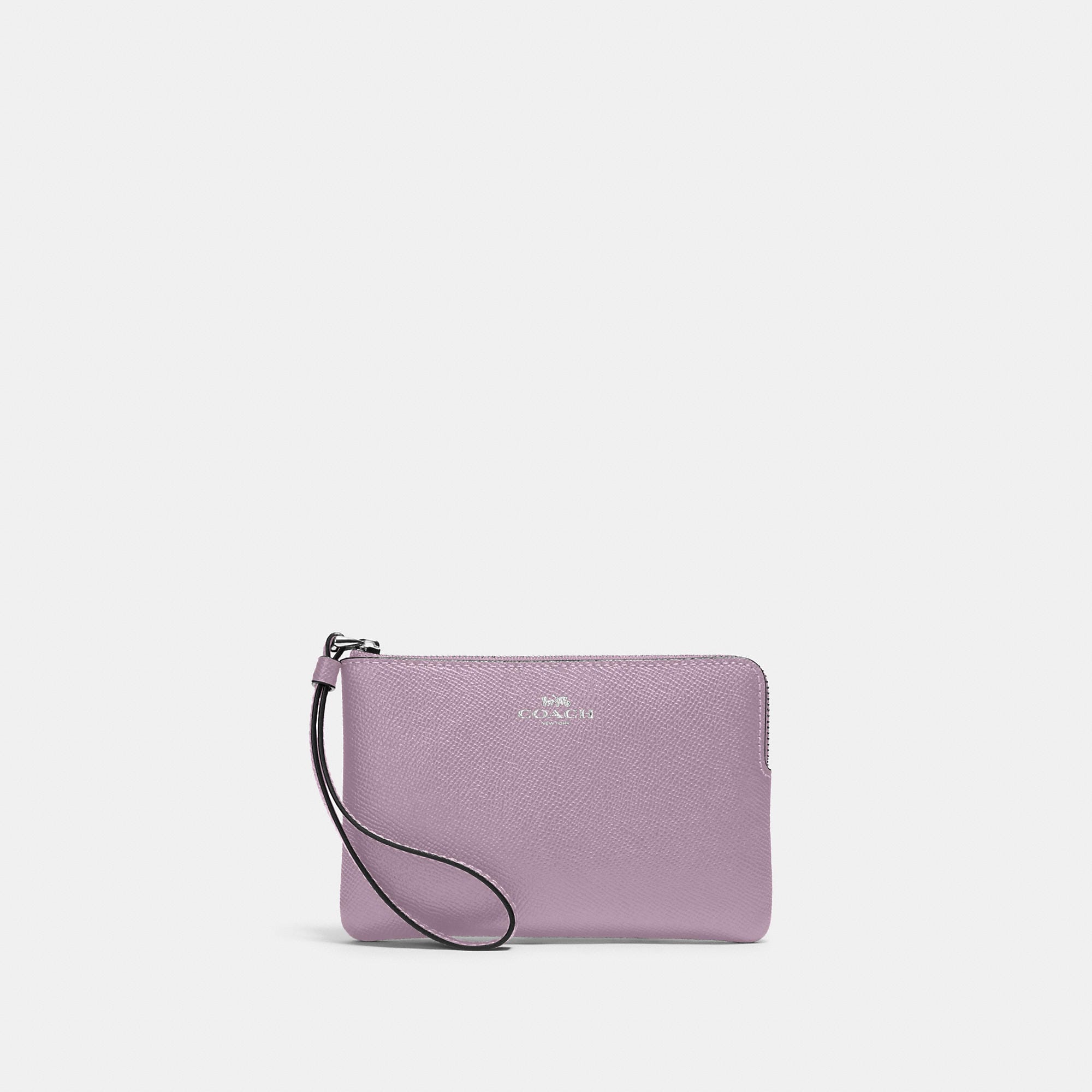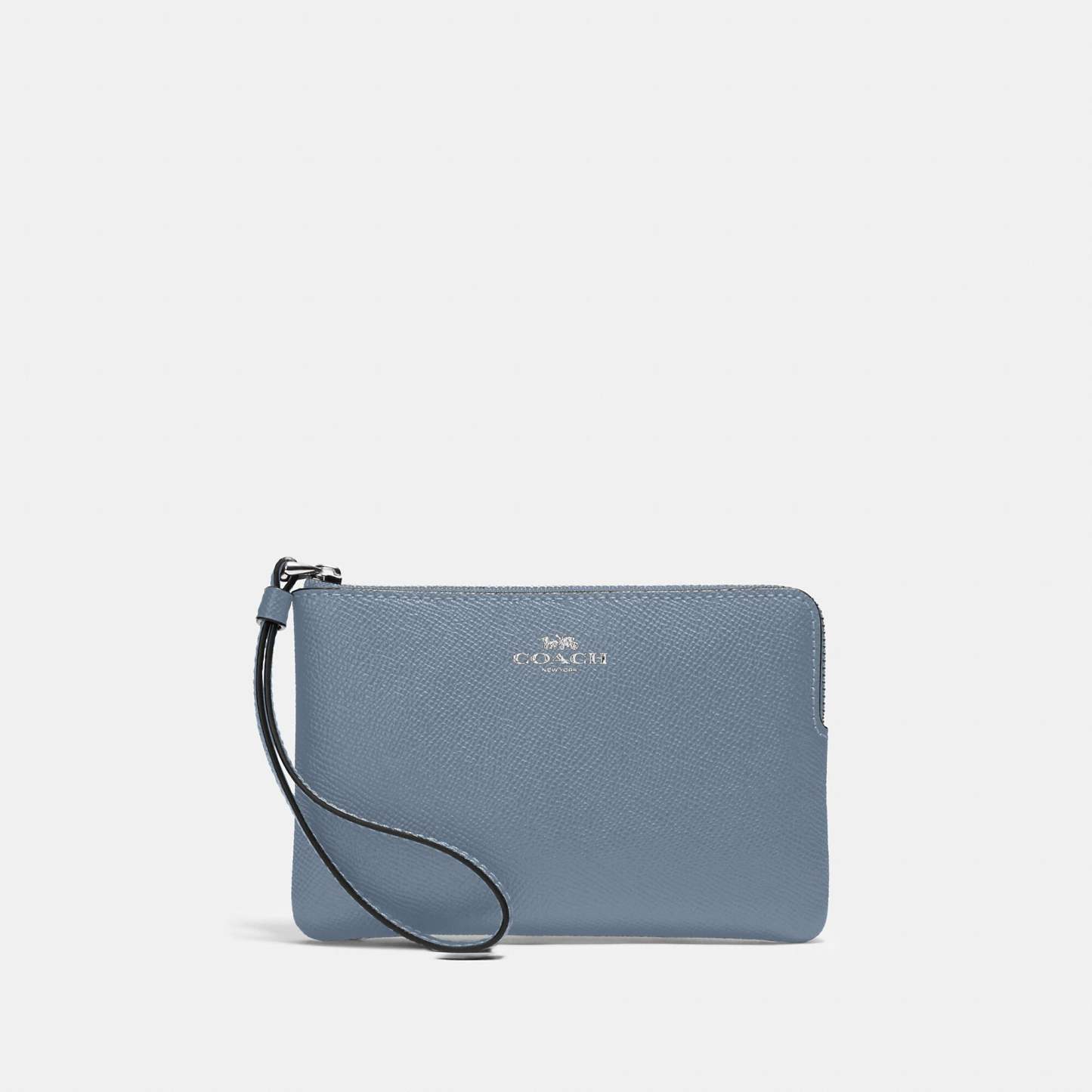 Crossgrain leather Two credit card slots Zip-top closure fabric lining Wrist strap attached 6 1/4 (L) x 4 (H) x 1/2 (W) Style No. 58032
