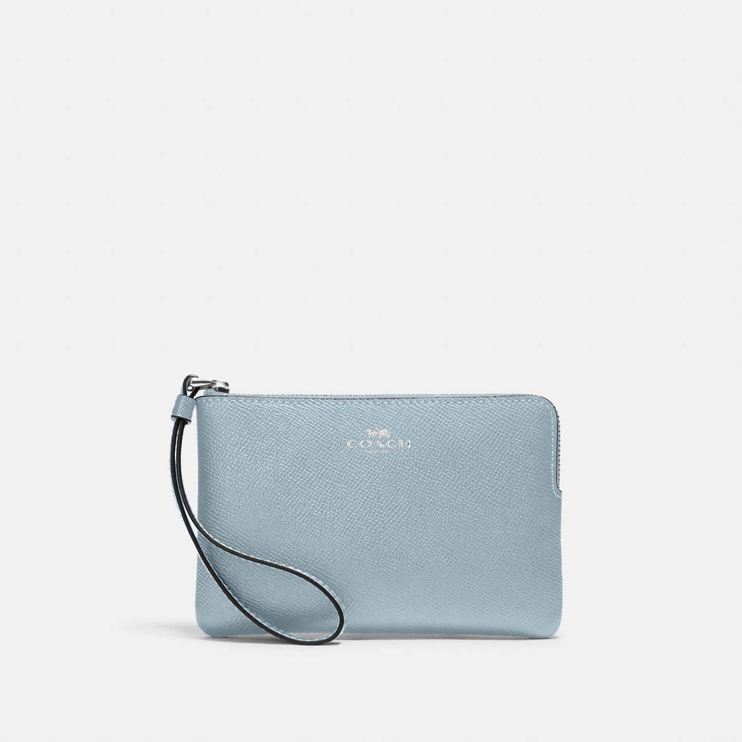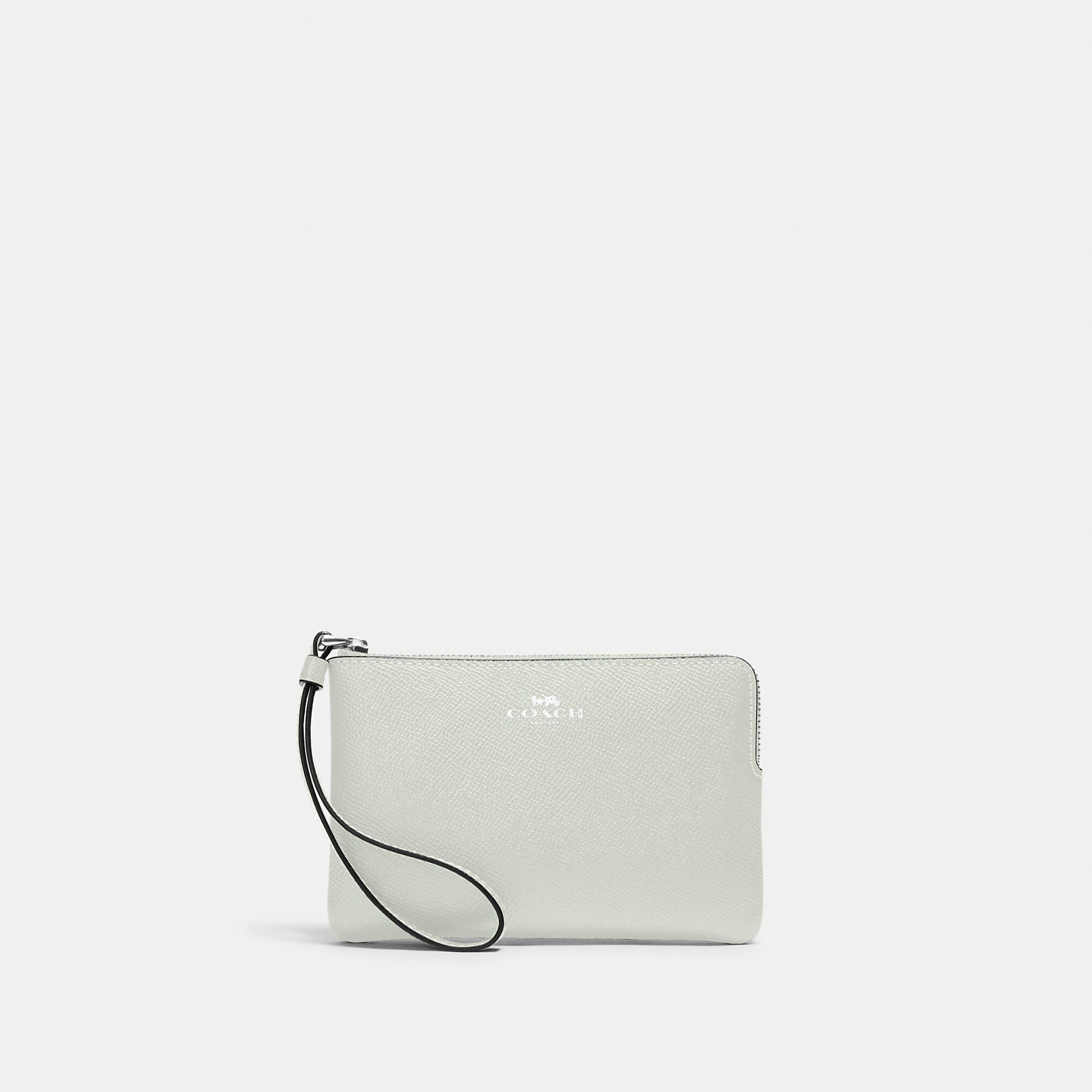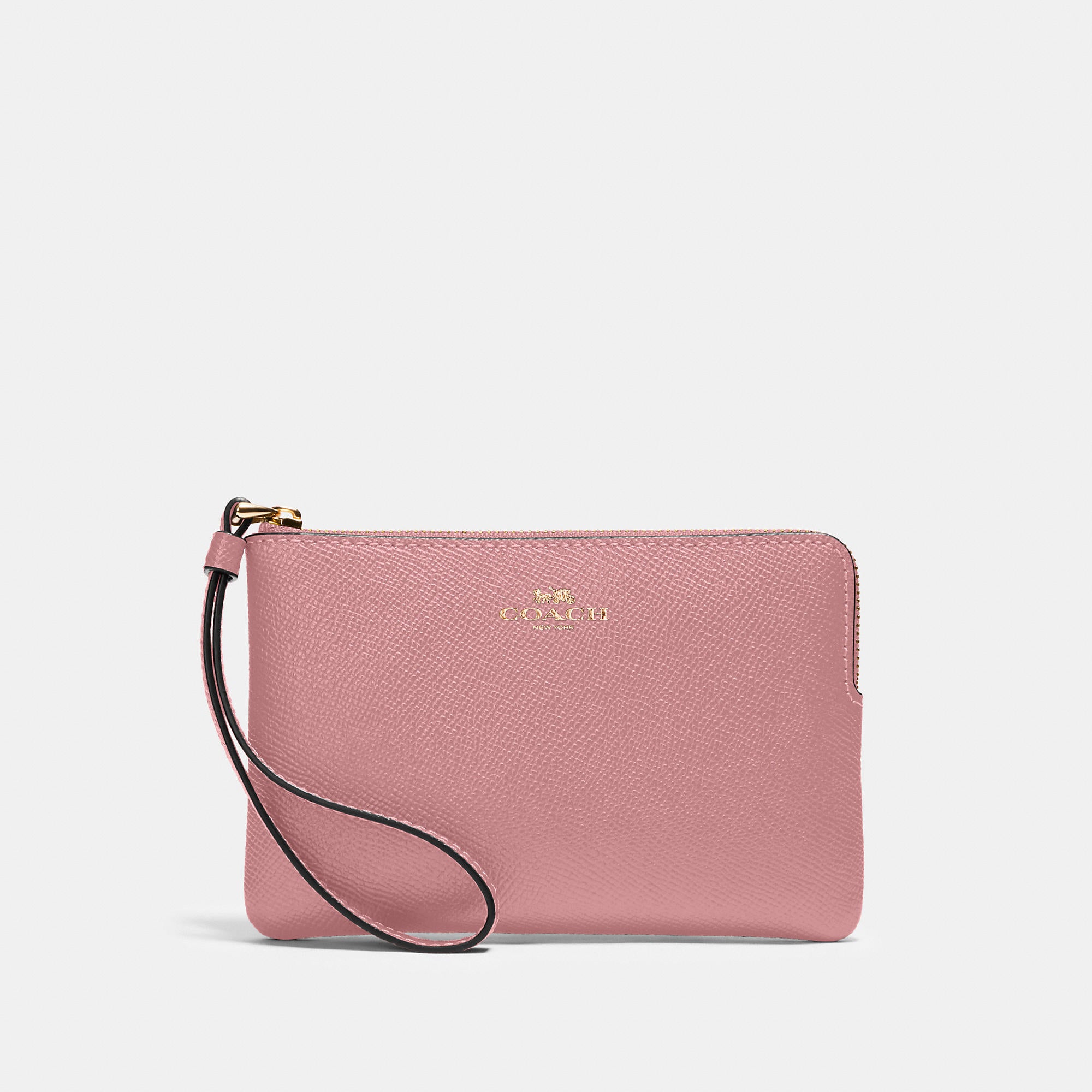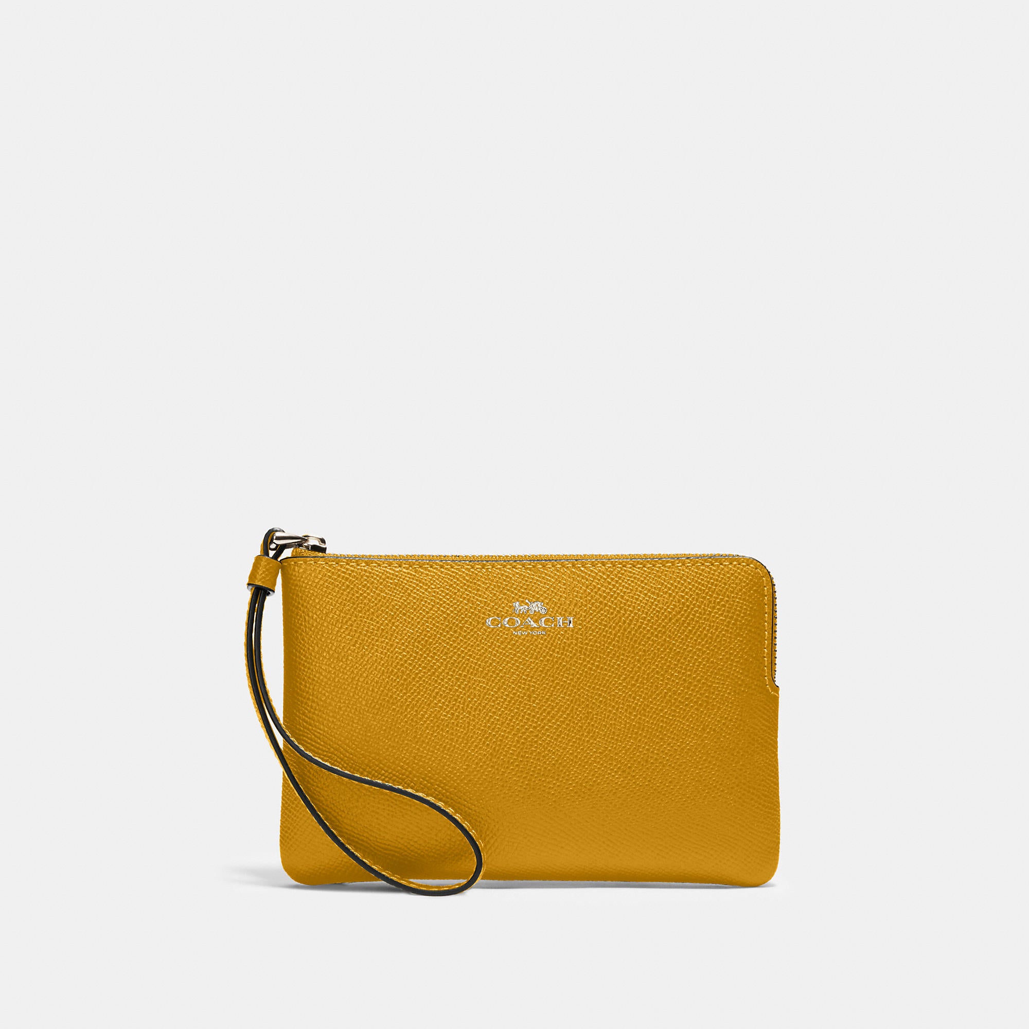 Crossgrain leather Two credit card slots Zip-top closure fabric lining Wrist strap attached 6 1/4 (L) x 4 (H) x 1/2 (W) Style No. 58032