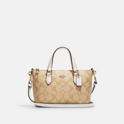 Signature coated canvas and smooth leather Two credit card slots Zip-top closure fabric lining Handles with 3 drop Detachable strap with 23 1/2 drop for shoulder or crossbody wear 7 1/4 (L) x 5 (H) x 3 1/2 (W) Style No. CH468 | Outlet Mini Gallery Crossbody In Signature Canvas - Beige