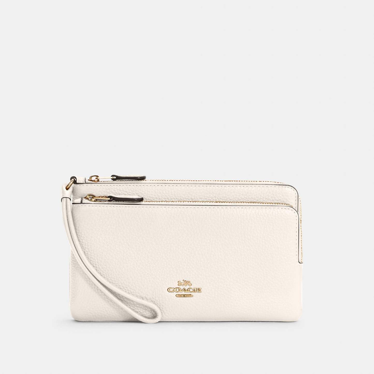 Refined pebble leather Eight credit card slots Inside open pockets Double zip closure fabric lining Wrist strap attached 8 (L) x 4 3/4 (H) x 1 (W) Fits all phone sizes up to an iPhone X and Samsung S7 Edge Style No. C5610 | Outlet Double Zip Wallet - Black