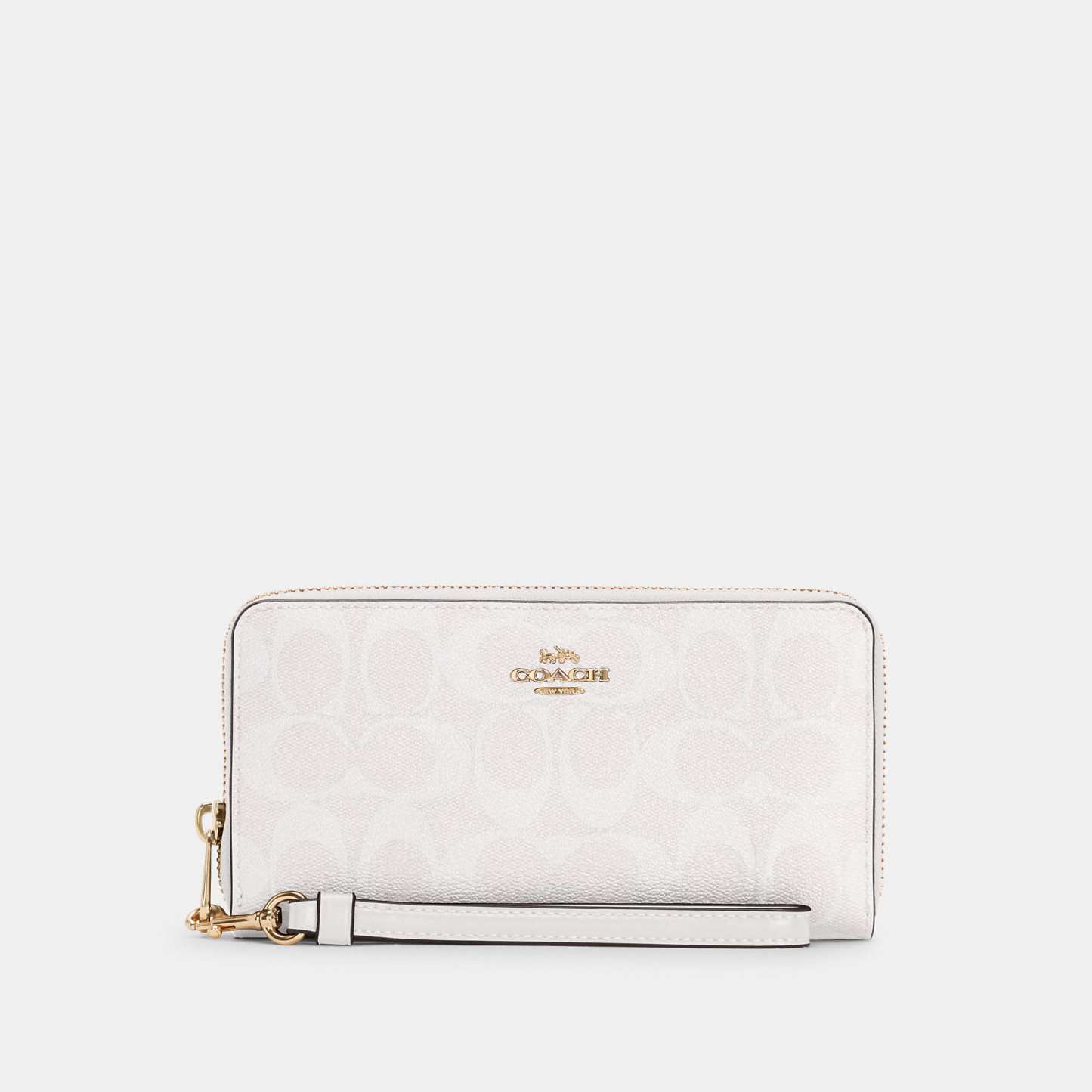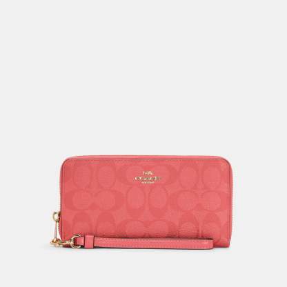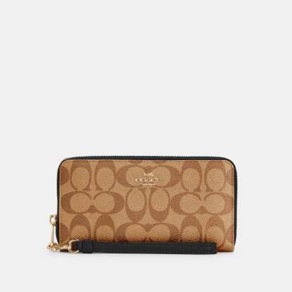 Signature coated canvas and smooth leather Twelve credit card slots Full-length bill compartments Inside zip coin pocket Zip-around closure Detachable wrist strap 7 1/2 (L) x 4 (H) x 1 (W) Fits all iPhone and Samsung Galaxy phones Style No. C4452