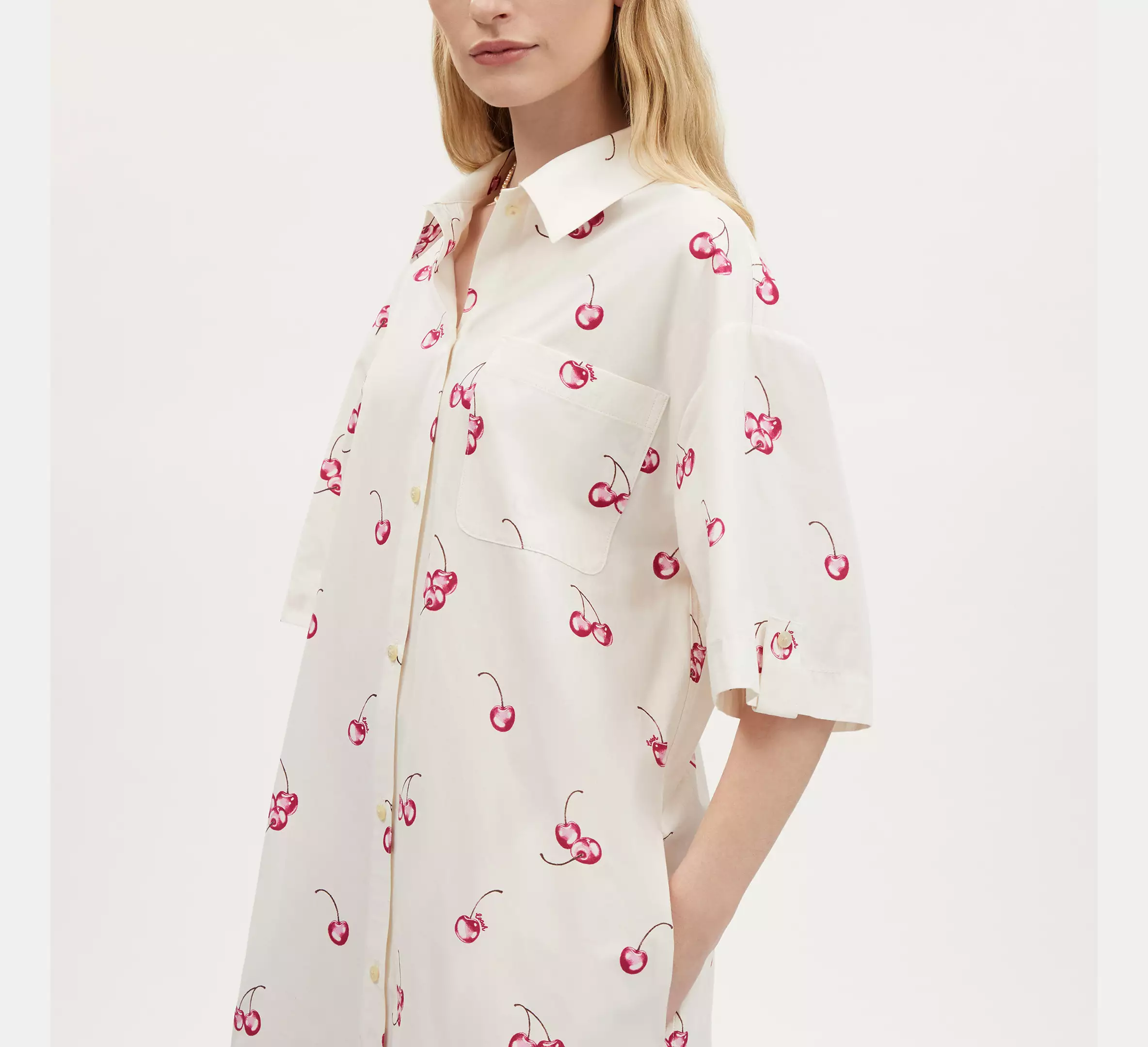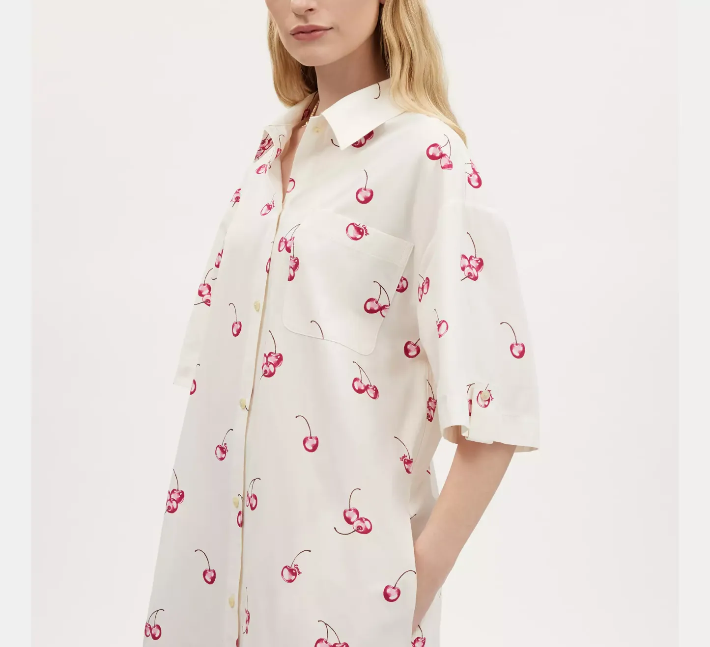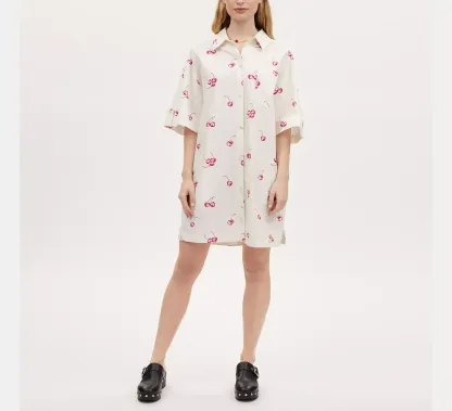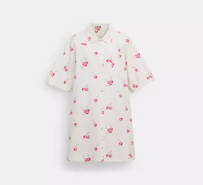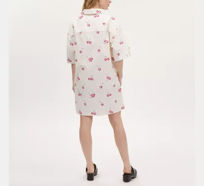 Cherry Print Button Front Short Dress In Organic Cotton
