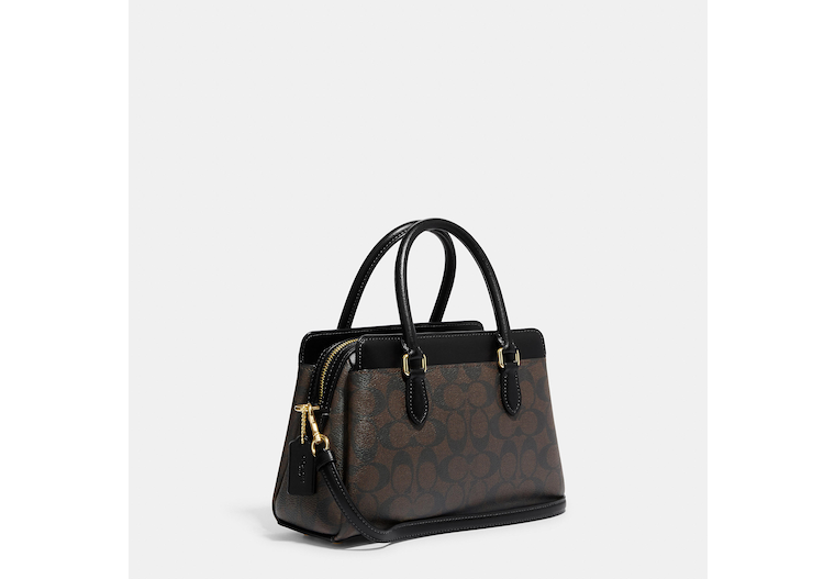 Signature coated canvas and smooth leather Inside multifunction pocket Zip closure fabric lining Side slip compartments Handles with 4 drop Outside open pockets Detachable strap with 21 1/2 drop for shoulder or crossbody wear Four protective feet at base 10 1/4 (L) x 6 3/4 (H) x 4 1/4 (W) Style No. CH174 | Outlet Mini Darcie Carryall In Signature Canvas - Brown
