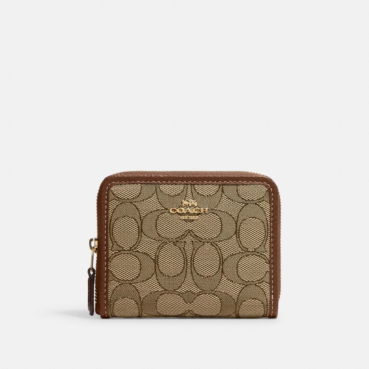 Signature jacquard and refined pebble leather Two credit card slots ID window Bill compartment Inside zip coin pocket Zip-around closure Outside zip coin pocket 4 1/2 (L) x 3 3/4 (H) x 3/4 (W) Style No. CH389 | Outlet Small Zip Around Wallet In Signature Jacquard - Brown