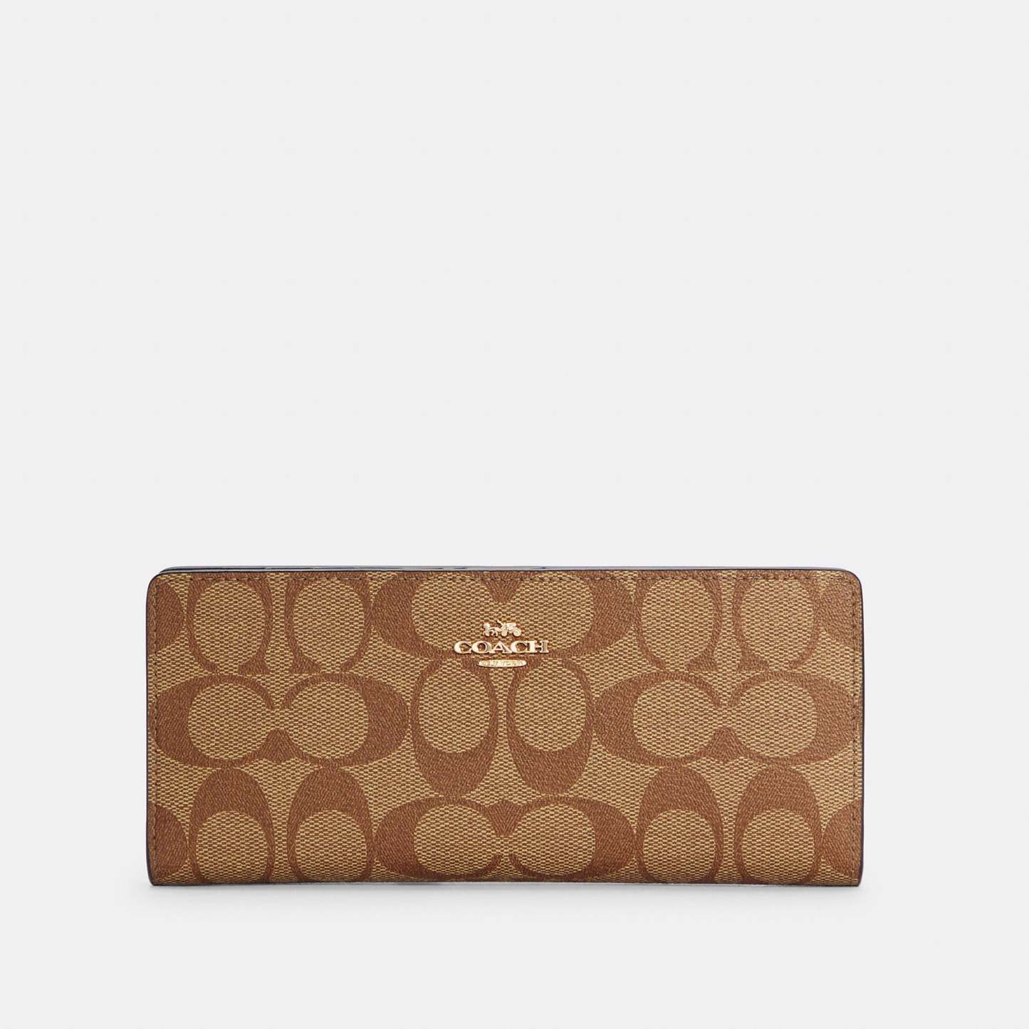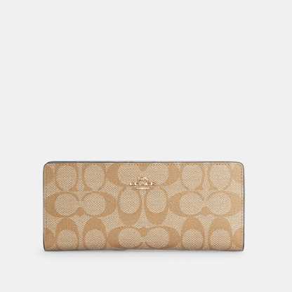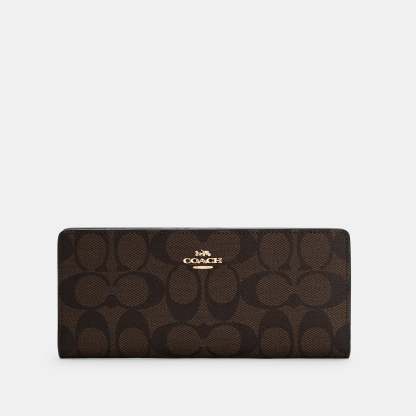 Signature coated canvas and smooth leather 12 credit card slots Full-length bill compartments Snap closure Outside zip pocket Wrist strap attached 7 1/4 (L) x 3 1/2 (H) x 1/2 (W) Style No. C3549 | Outlet Slim Wallet In Signature Canvas - Brown
