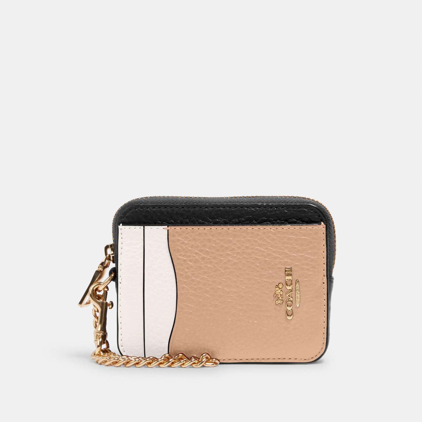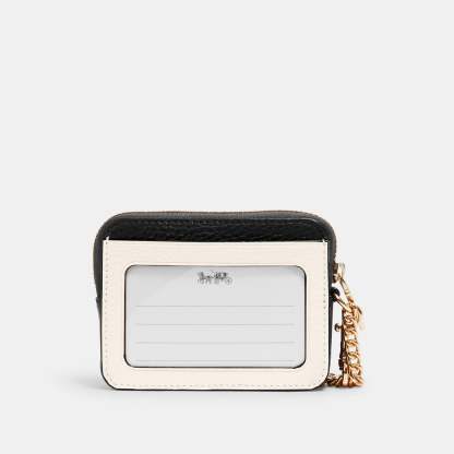 Refined pebble leather Two credit card slots ID window Open pockets Zip compartment Chain wrist strap with dogleash clip attached 3 (L) x 4 1/4 (H) x 3/4 (W) Style No. C1886 | Outlet Zip Card Case In Colorblock - White