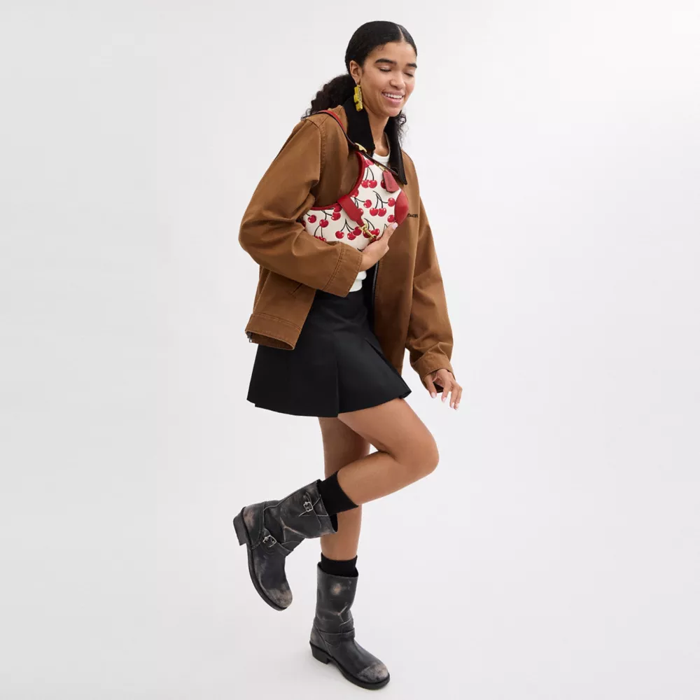 The Hamptons Hobo Bag is part of The Coach Originals, a collection of archival-inspired bags that celebrates our legacy and authentic New York heritage. Crafted of glovetanned leather featuring a cheerful cherry print detailed with glittery accents for a touch of sparkle, this hobo is based on a 2005 best-selling Coach design reimagined for today. Finished with our sleek clip hardware closure, the structured zip-top silhouette has an adjustable short shoulder strap to sit just beneath the underarm for hands-free convenience and a spacious interior with room for your phone, wallet, keys, and other essentials. Some styles are just too good to leave in the archives.