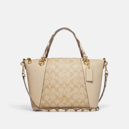 Signature coated canvas refined leather and snake-embossed leather Inside zip pocket Zip-top closure fabric lining Handles with 5 drop Outside zip pocket Detachable strap with 22 drop for shoulder or crossbody wear 10 (L) x 8 1/2 (H) x 3 3/4 (W) Style No. C7261 | Outlet Kacey Satchel In Colorblock Signature Canvas - Multi